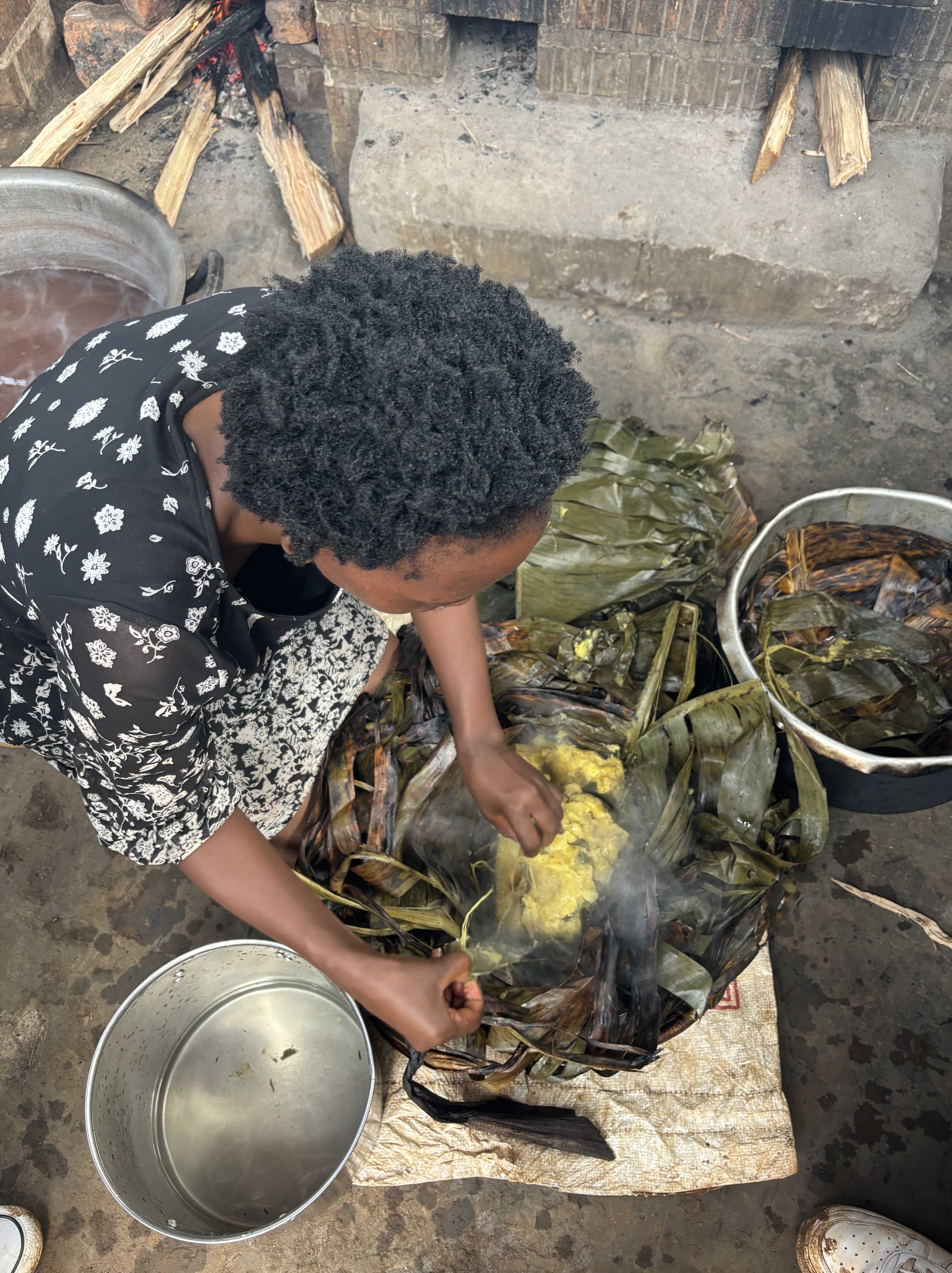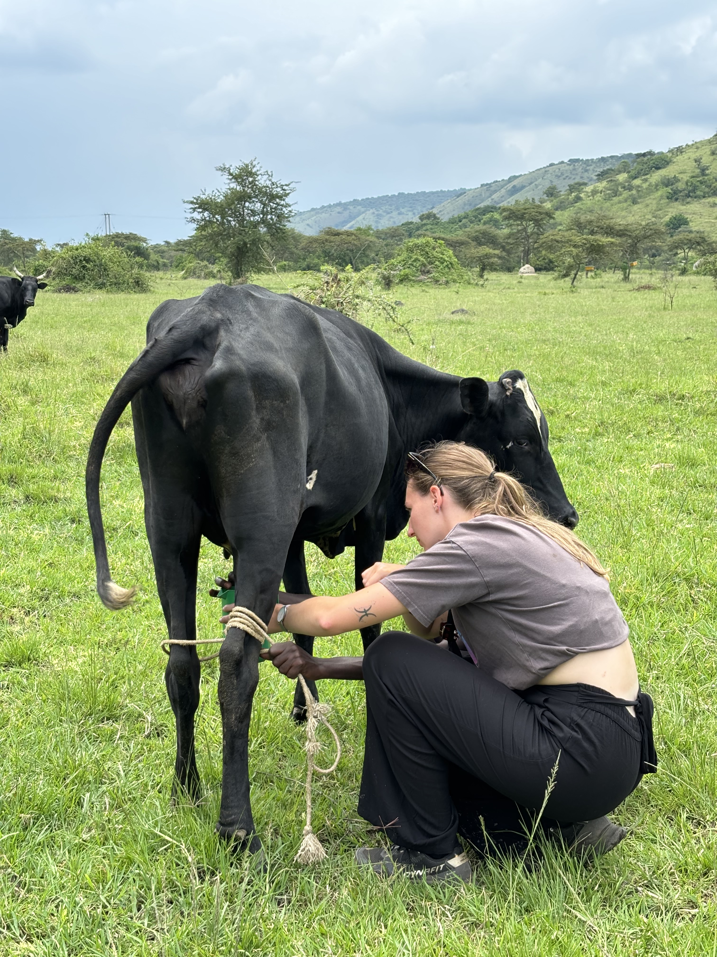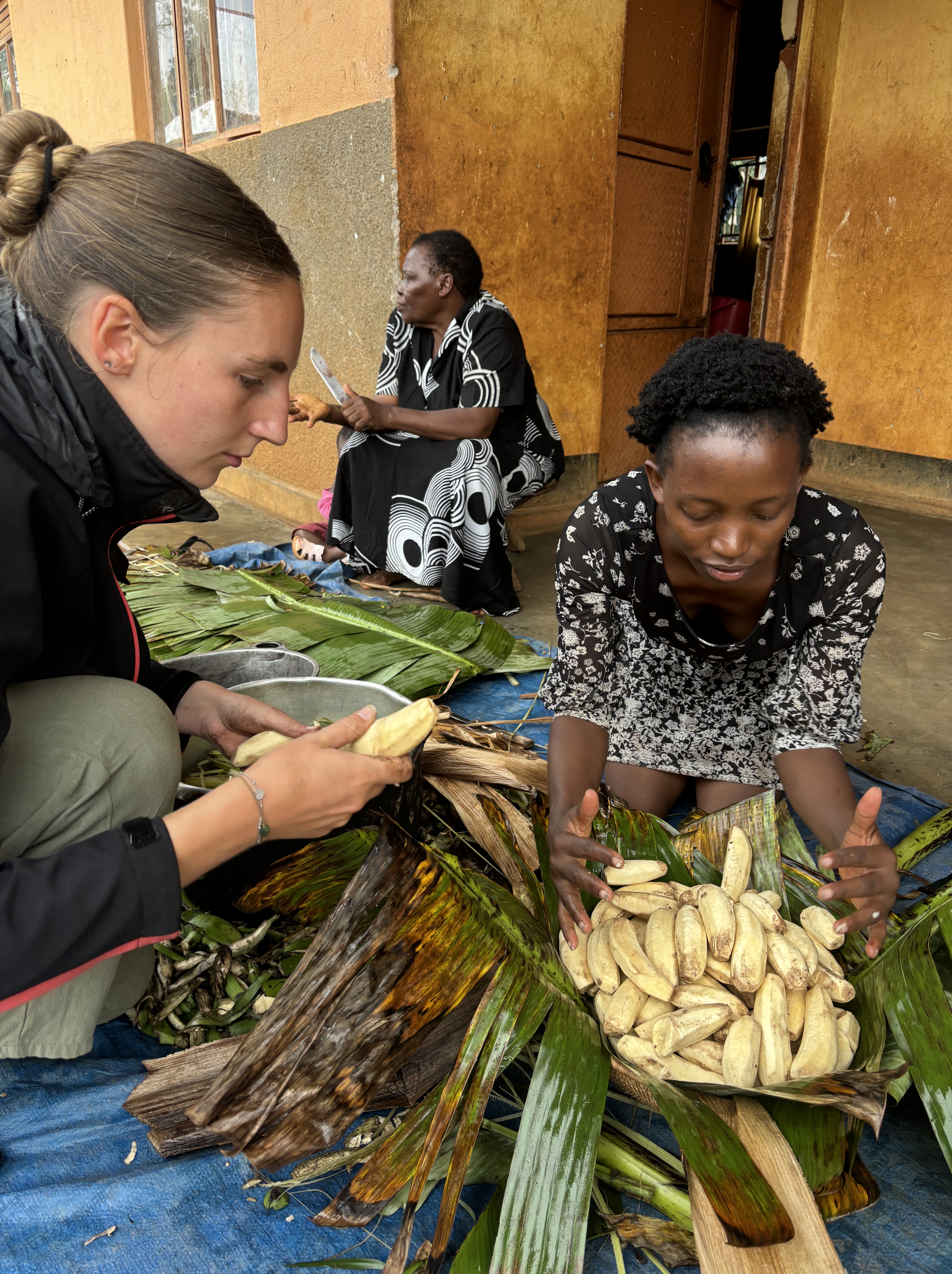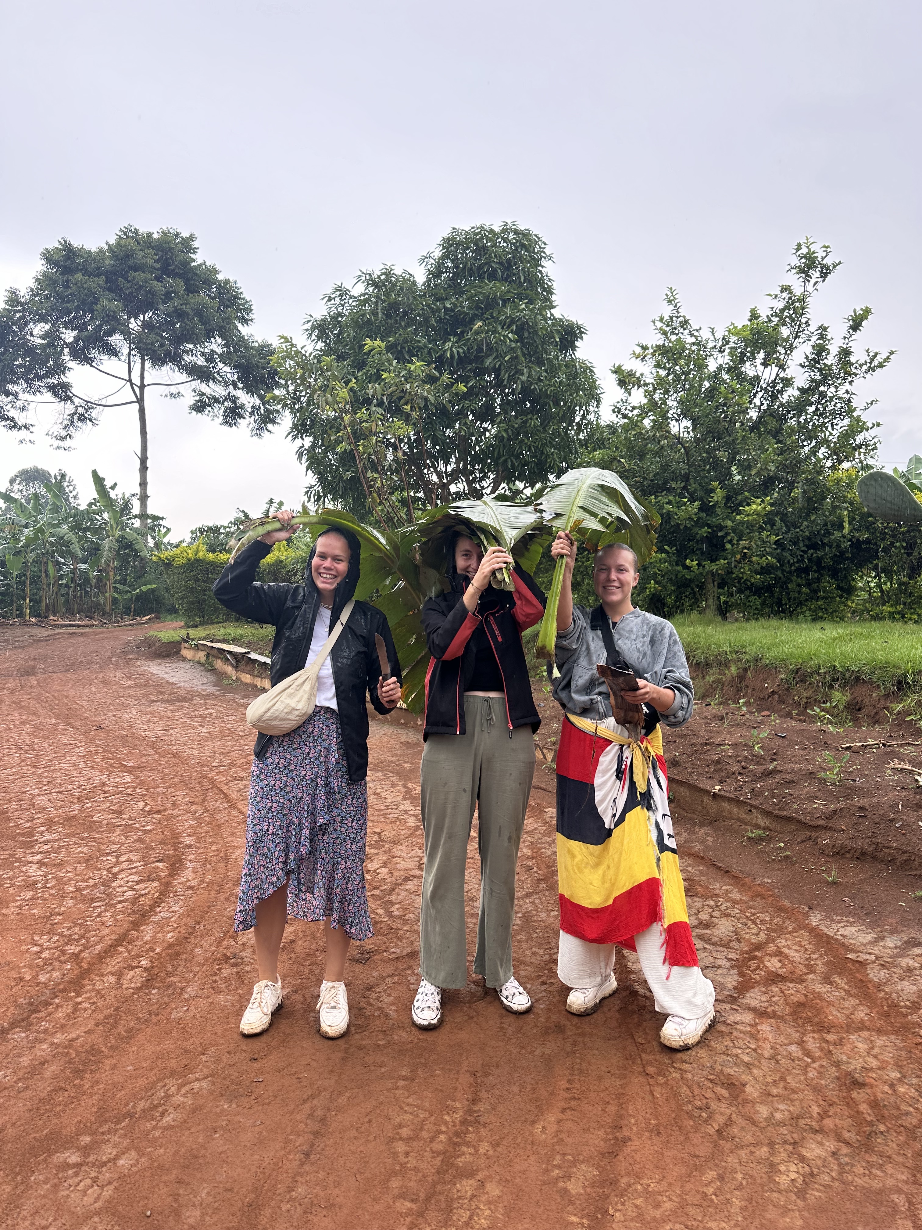 Tijdens een mini game drive door het park kwamen we vast te zitten met de safari bus in de modder… Dus hup de bus uit, om te gaan duwen. We waren omringt door giraffen, dat maakte de situatie heel erg bijzonder. Door het draaien van de wielen zaten we allemaal onder de modder, maar gelukkig konden we er allemaal mee lachen. De weg voortgezet en een bezoek gebracht aan een dichtbijgelegen cultureel dorpje. Een koeienhouder ontmoet met z’n koeien en geprobeerd te melken, dat was moeilijker dan verwacht. Hij zorgt goed voor de koeien en het was meer dan duidelijk dat hij om ze geeft. Het is normaal dat de mannen de melk winnen en de vrouwen hier thuis mee aan de slag gaan. Dat is waarom we naar de vrouw van hem gingen en ze liet ons zien hoe het traditionele proces van het maken van boter in zijn werk gaat. Ze liet zien hoe ze de traditionele melkpotten schoonmaken door middel van rook en ook wij mochten dit proberen. We mochten allemaal melk proeven uit een traditionele pot en er werd nog veel meer verteld over hun tradities in hun cultuur. In de regen teruggelopen naar de bus die ons terugbracht richting Masaka. Onderweg een kleine tussenstop gemaakt in een dorpje om aan de zijkant van de weg een rolex te scoren, een nieuw lokaal gerecht voor Monique en Richard.