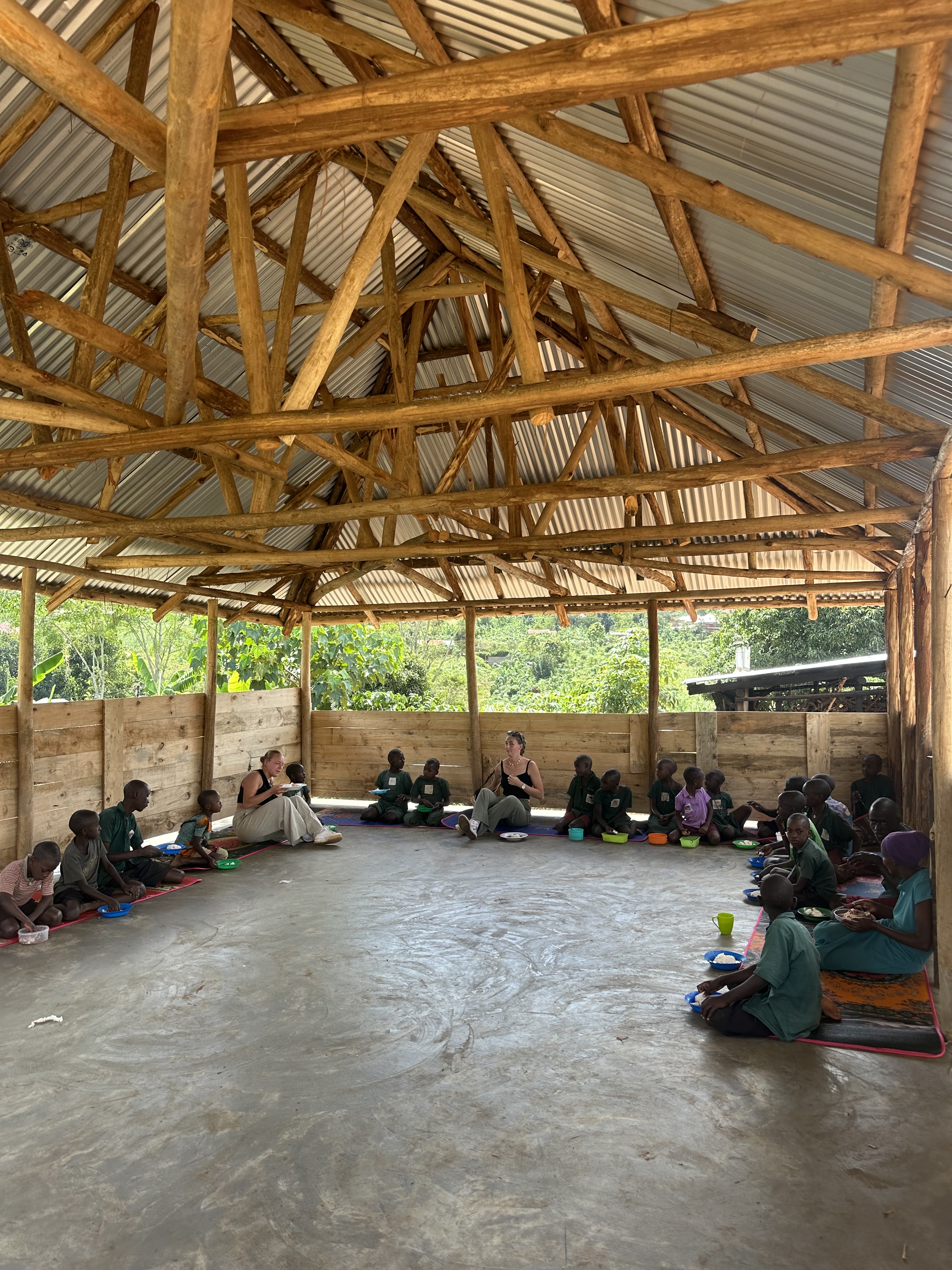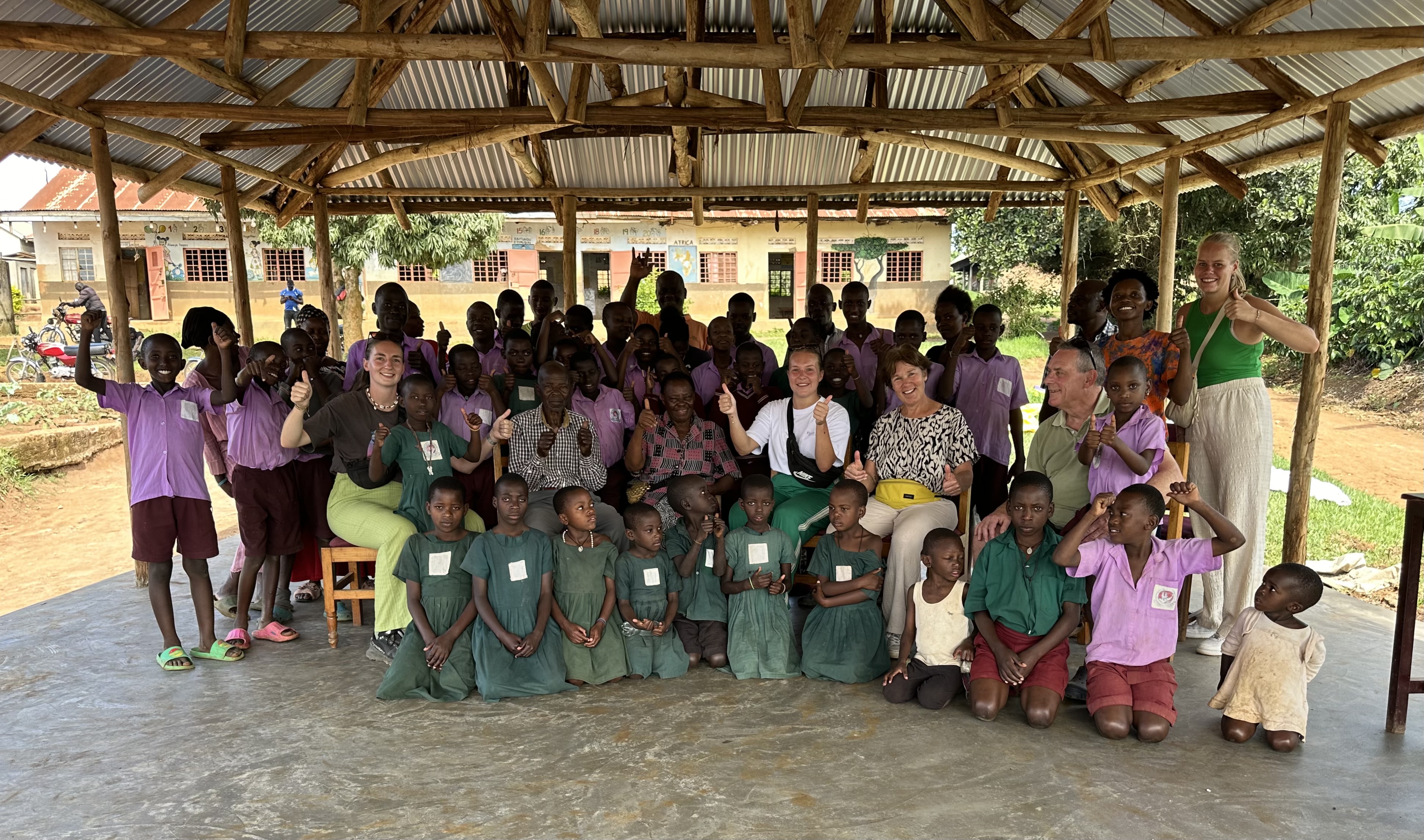 Onze appartementen laten zien en daarna even bijgekomen voordat we verder gingen naar de school. Bij aankomst op de school stond er een tafel onder de dining structure klaar met vier stoelen. We mochten plaatsnemen en er werd gelijk eten geserveerd, matooke en ground nuts met zilvervisjes. Het is cultuur om eerst te eten en daarna iedereen te ontmoeten en de school te laten zien. Opa en oma kwamen erbij zitten en waren heel blij door dit speciale bezoek. Na een paar happen hadden we alle vier genoeg gehad en dus was het tijd om de kinderen en de docenten te ontmoeten. Samen bedachten de kindjes voor Monique en Richard een toepasselijke sign name gebaseerd op hun uiterlijk en daarna konden ze de ballen en lolly’s overhandigen aan de kids. Ze waren er super blij en stuk voor stuk bedankten ze Monique en Richard. We konden ze nu eindelijk de school laten zien waar we al zo lang mee samen werken. De klaslokalen, de keuken, de tuin en de slaaplekken laten zien aangevuld door wat informatie verteld door Rosemary. Super leuk dat ze de school hebben gezien en ook de dining structure die inmiddels bijna af is. Wij kijken er wel naar uit om weg te gaan hier en te beginnen aan onze reis dus we halen er zelf wat minder energie uit omdat we er klaar mee zijn. Voor Monique en Richard jammer om te zien, hun hebben hier natuurlijk een ander gevoel bij momenteel. Alles is voor hun de eerste keer en het zijn allemaal nieuwe indrukken wat voor hun erg bijzonder is.