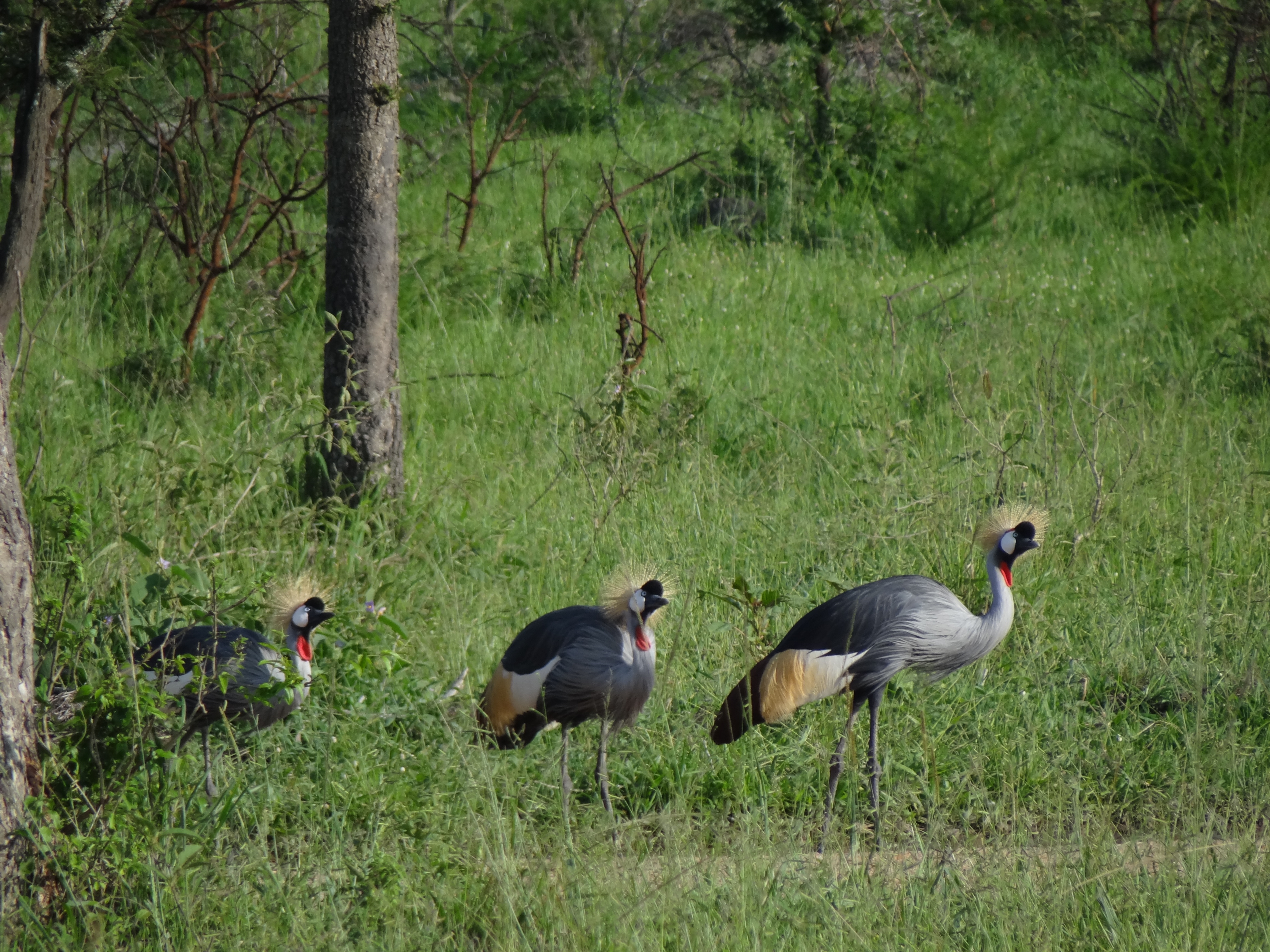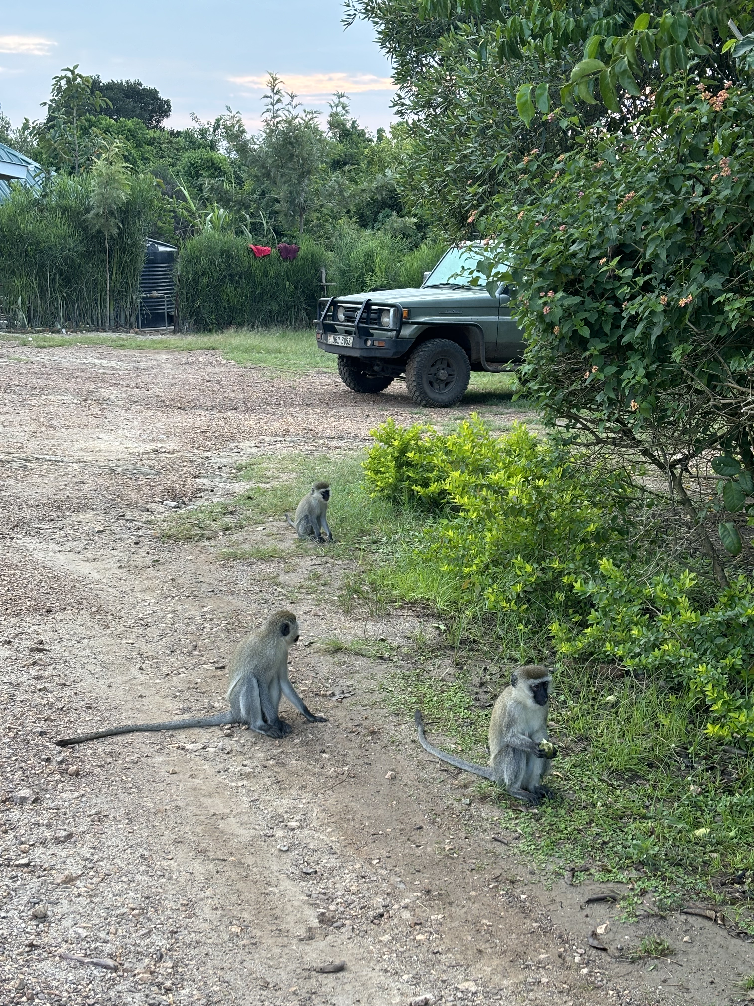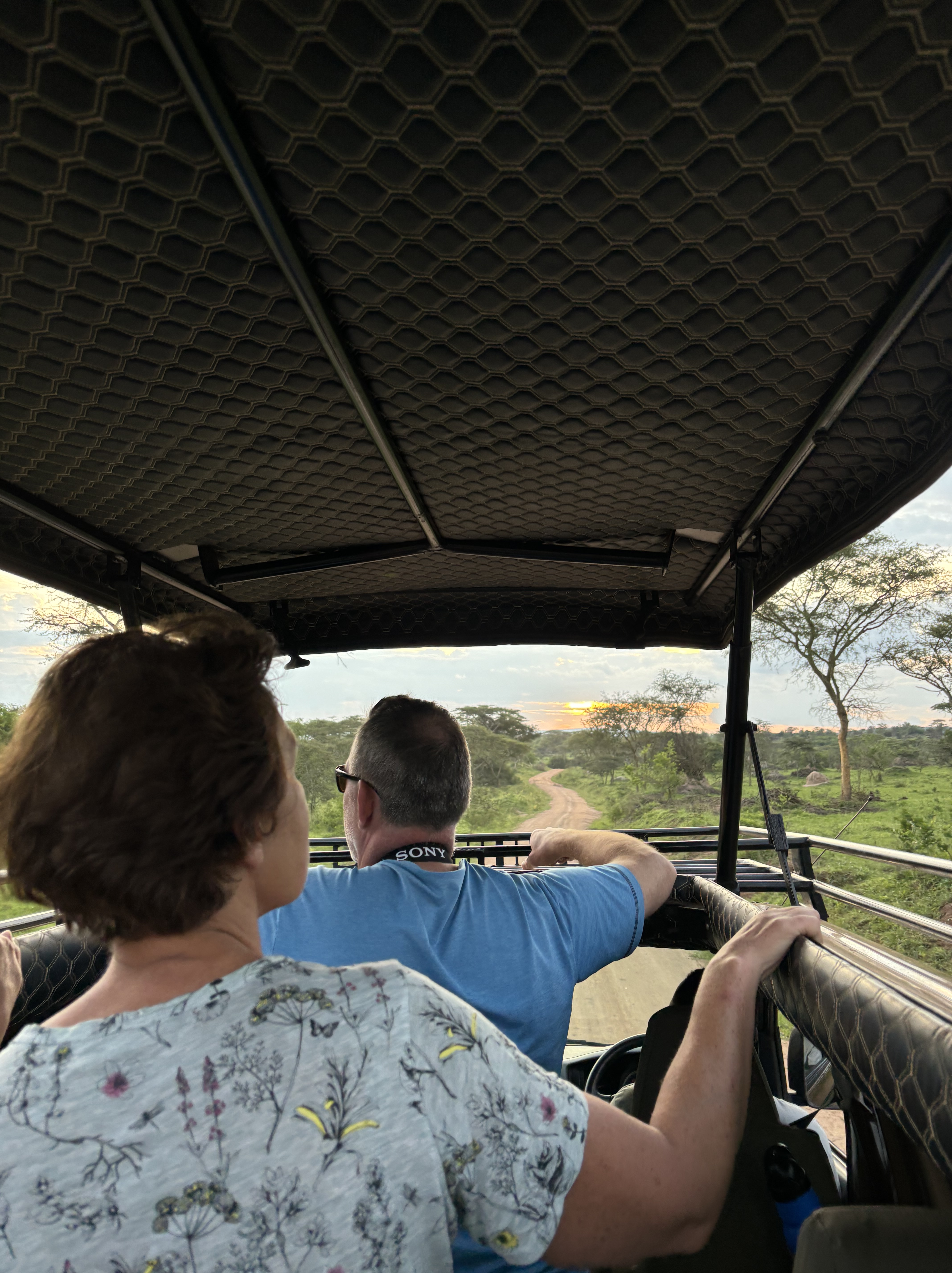 Voor Monique en Richard was dit de eerste safari en ze waren door de bootsafari al helemaal enthousiast. Het dak van de safari auto ging omhoog, dus de game drive kon beginnen. Het Lake Mburo National Park is heel anders dan het Queen Elizabeth National Park waar we eerder waren. Heuvelachtiger, meer begroeiing en andere dieren zoals giraffen, zebra’s, baboons, impala’s, kraanvogels en heel veel andere vogels. Op een gegeven moment, stuitten we op een groep giraffen, apen en kraanvogels, we wisten niet waar we moesten kijken. Een flinke hobbelweg terug naar de lodge waar we ons konden opfrissen in onze mooie kamer met een heerlijke warme douche! De bananensoep stond al voor ons klaar en hierna volgende de beef teriyaki met rijst en een stukje cake als dessert. Onder het genot van een wijntje deze indrukwekkende dag afgesloten. Heel bijzonder om dit zo met z’n vieren te mogen meemaken.