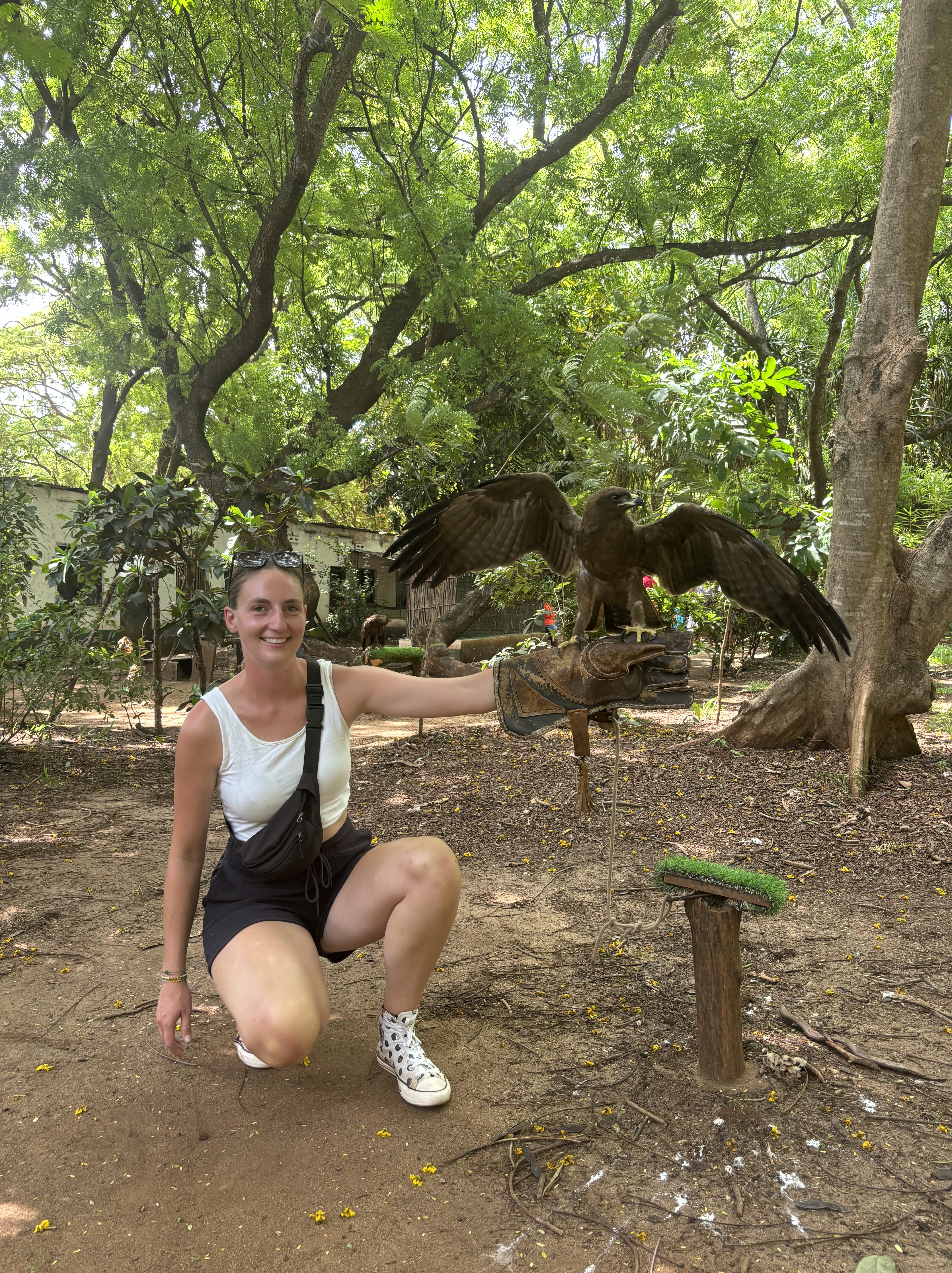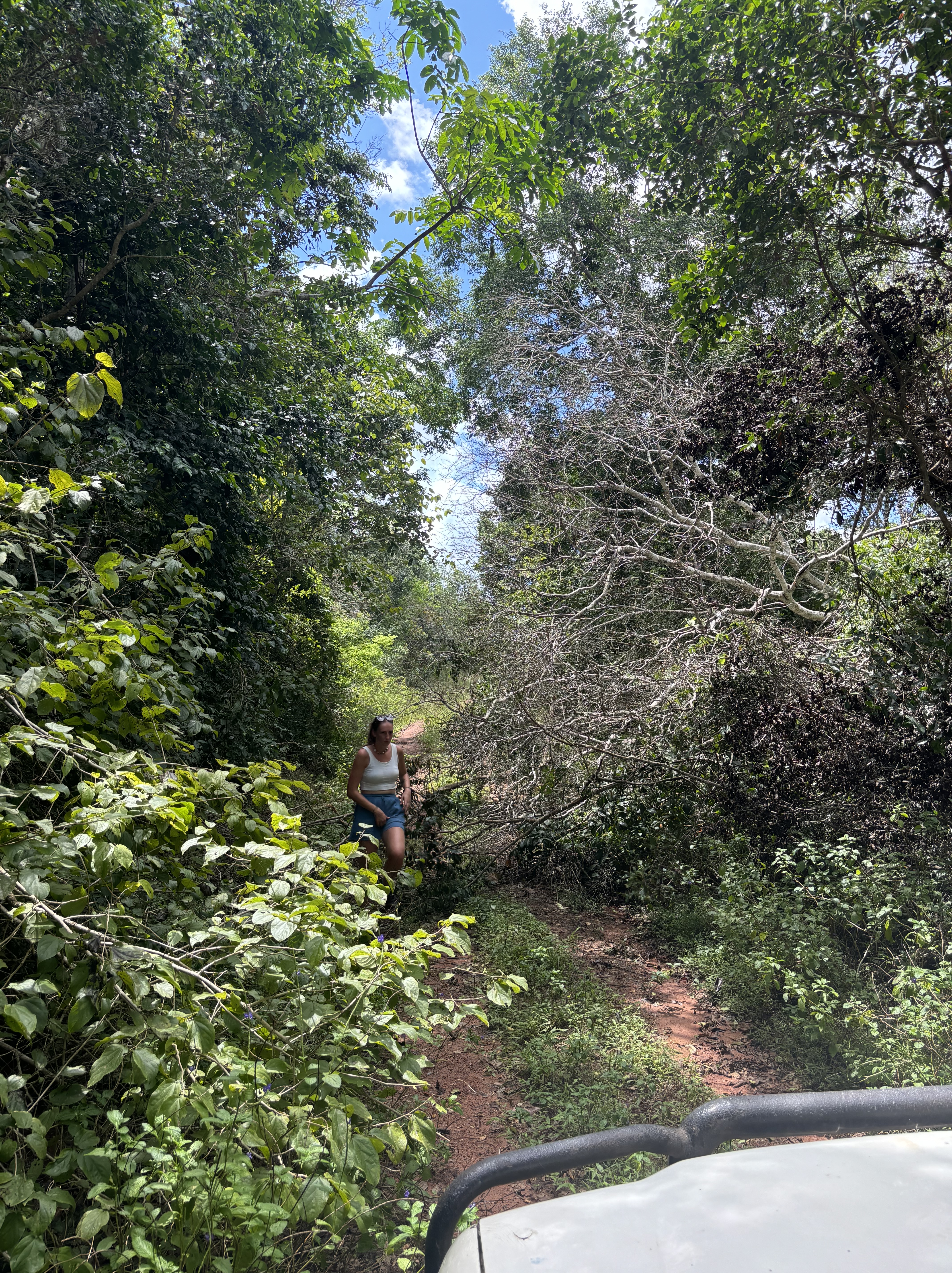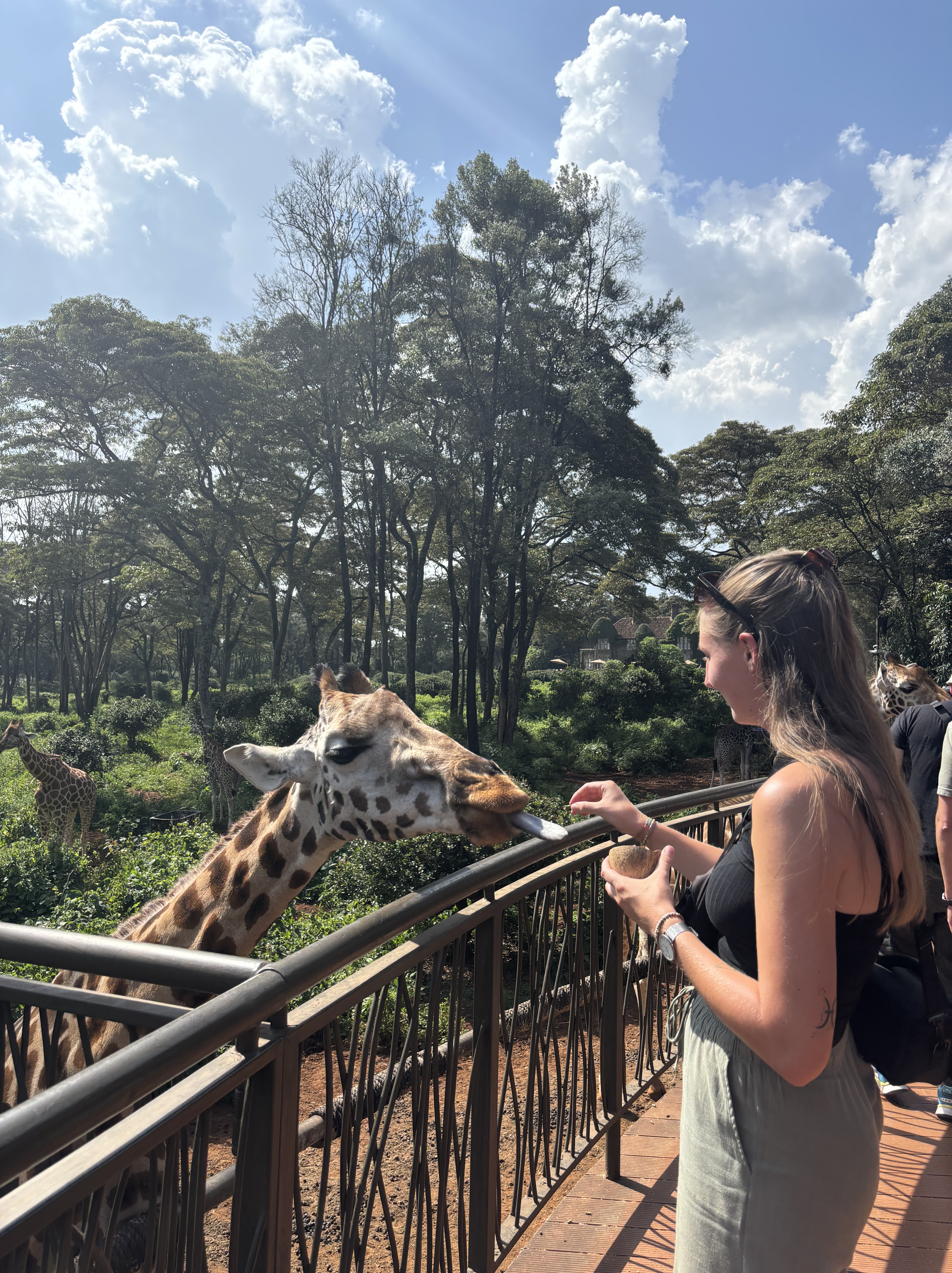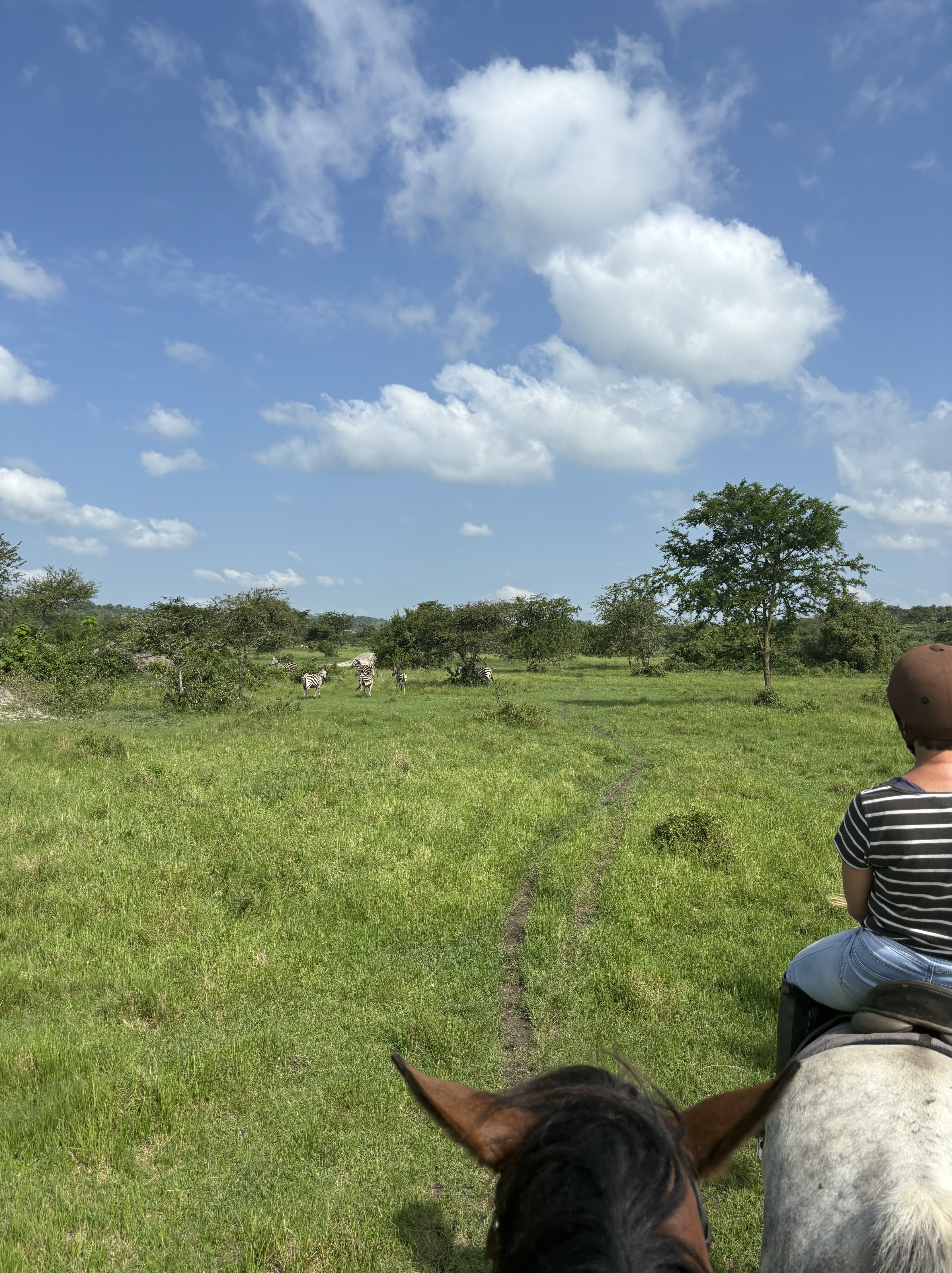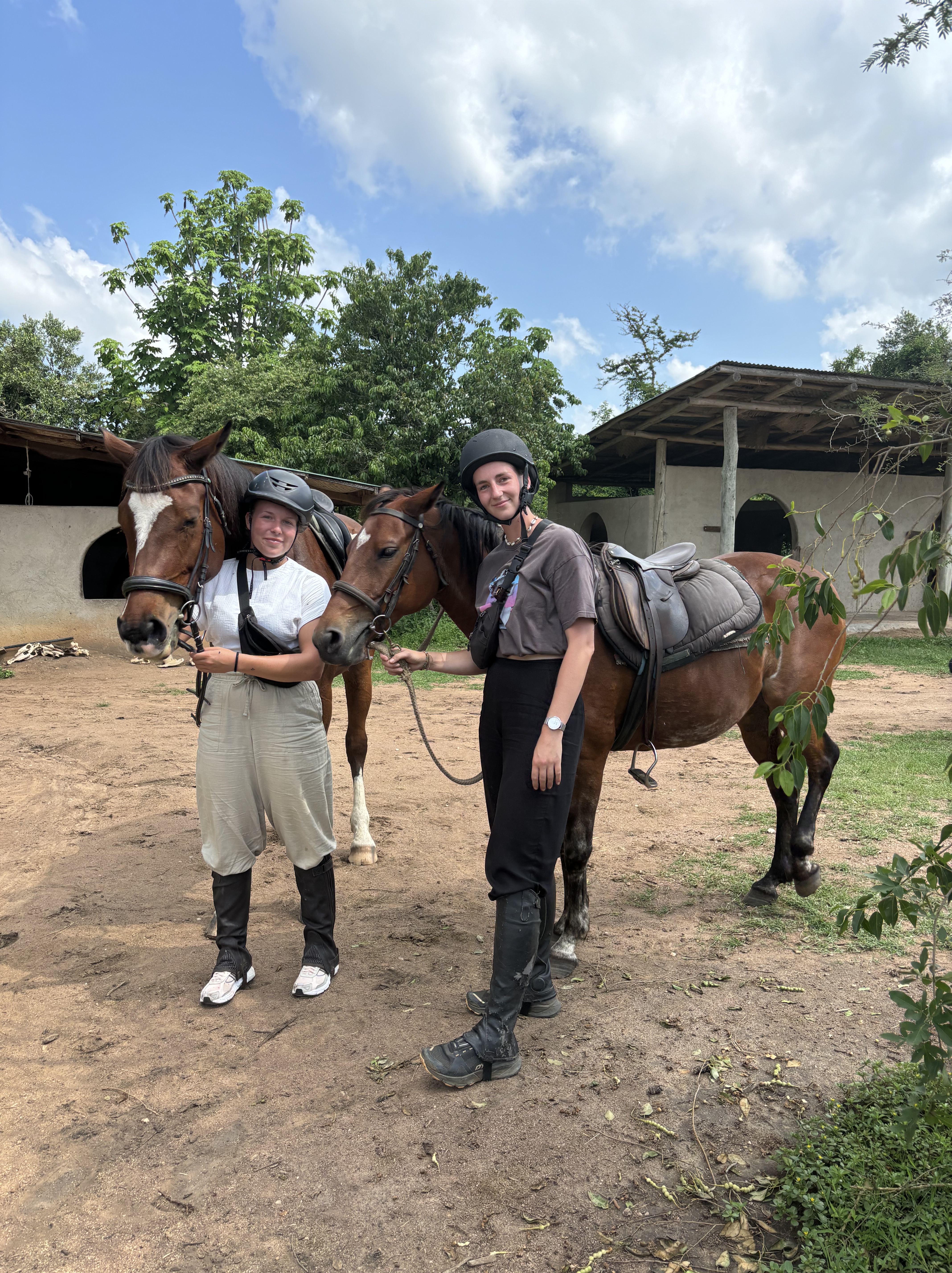 In tijden hebben we niet zo goed geslapen als hier. Het was een heerlijk bedje en het was zo stil om ons heen. Toen we wakker werden beseften we pas hoe slecht we normaal eigenlijk slapen. Vanuit ons balkon was er een prachtige zonsopkomst te zien, je kunt niet beter wakker worden dan dit. Uitgerust aan het uitgebreide ontbijt begonnen zodat we onze reis konden voortzetten naar de volgende activiteit. Een misselijkmakende autorit door de rimboe bracht ons naar een super-de-luxe lodge die de paardrijdsafari voor ons zou gaan verzorgen. Voordat we op het paard zaten, flink gelachen over hoe we eruit zagen. Lise met haar pofbroek en haar veel te grote helm waardoor ze leek op een ridder en Anouk met een helm die leek op een bowlingbal. Allemaal op een paard gestapt waardoor de rit kon beginnen. Het was zo’n bijzondere ervaring om te paard door het safaripark te rijden. Je gaat van de paden af en bent zo echt een met de natuur en de dieren. Na een uur genieten terug gereden naar de stallen en de paarden afgezadeld. Voor Monique en Lise een droom die uitkomt en voor ons allen iets om nooit te vergeten.