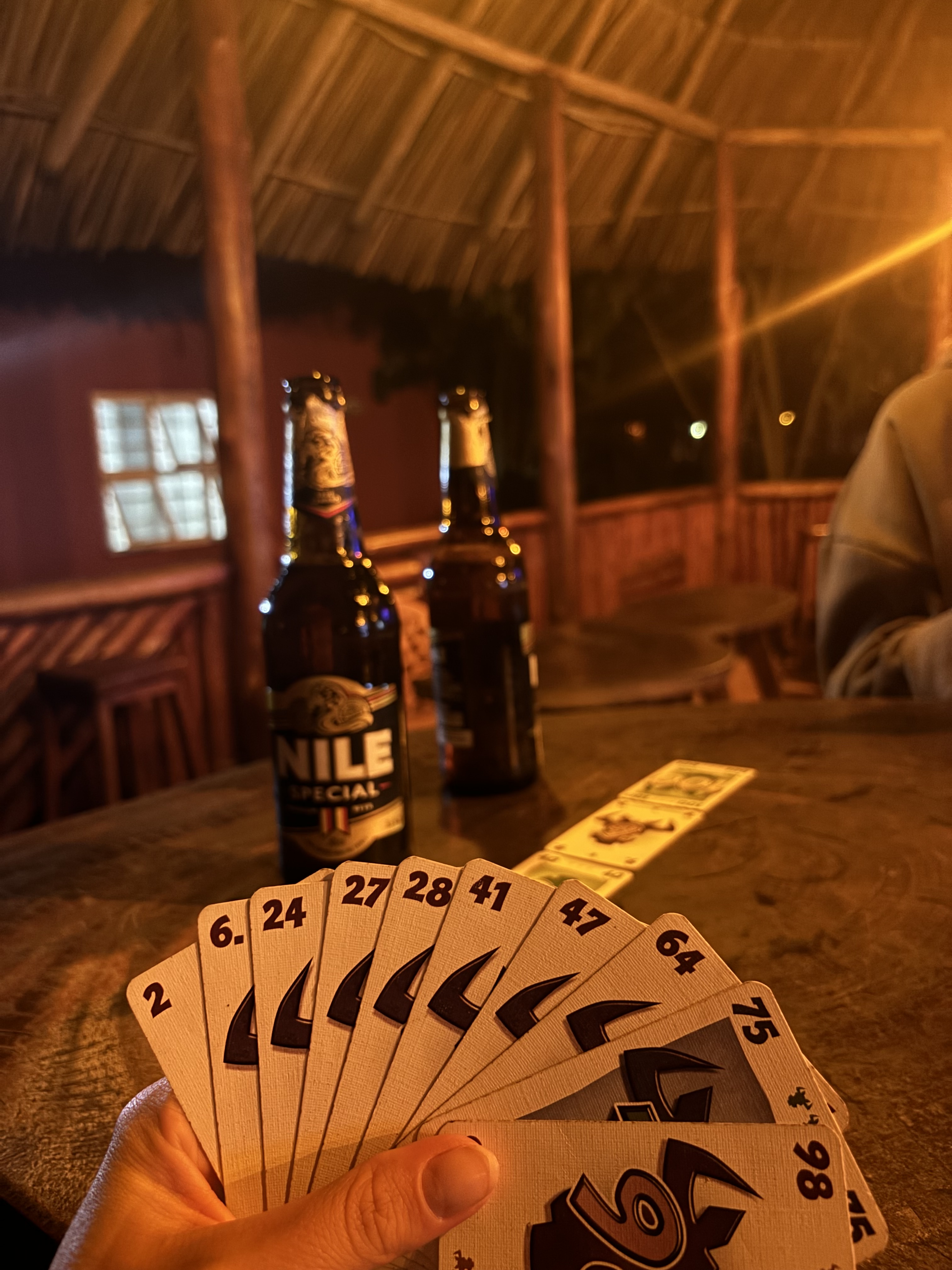 Na het bezoek aan de school een lekker koude Nile Special gedronken bij EBS. Monique en Richard een nieuw spelletje geleerd en later sloot Fleur aan om mee te eten. De mooie dagen samen gezellig afgesloten en ze teruggebracht naar Villa Katwe op de boda boda. Raar om weer afscheid te moeten nemen en ze weer pas te zien in januari op Schiphol.